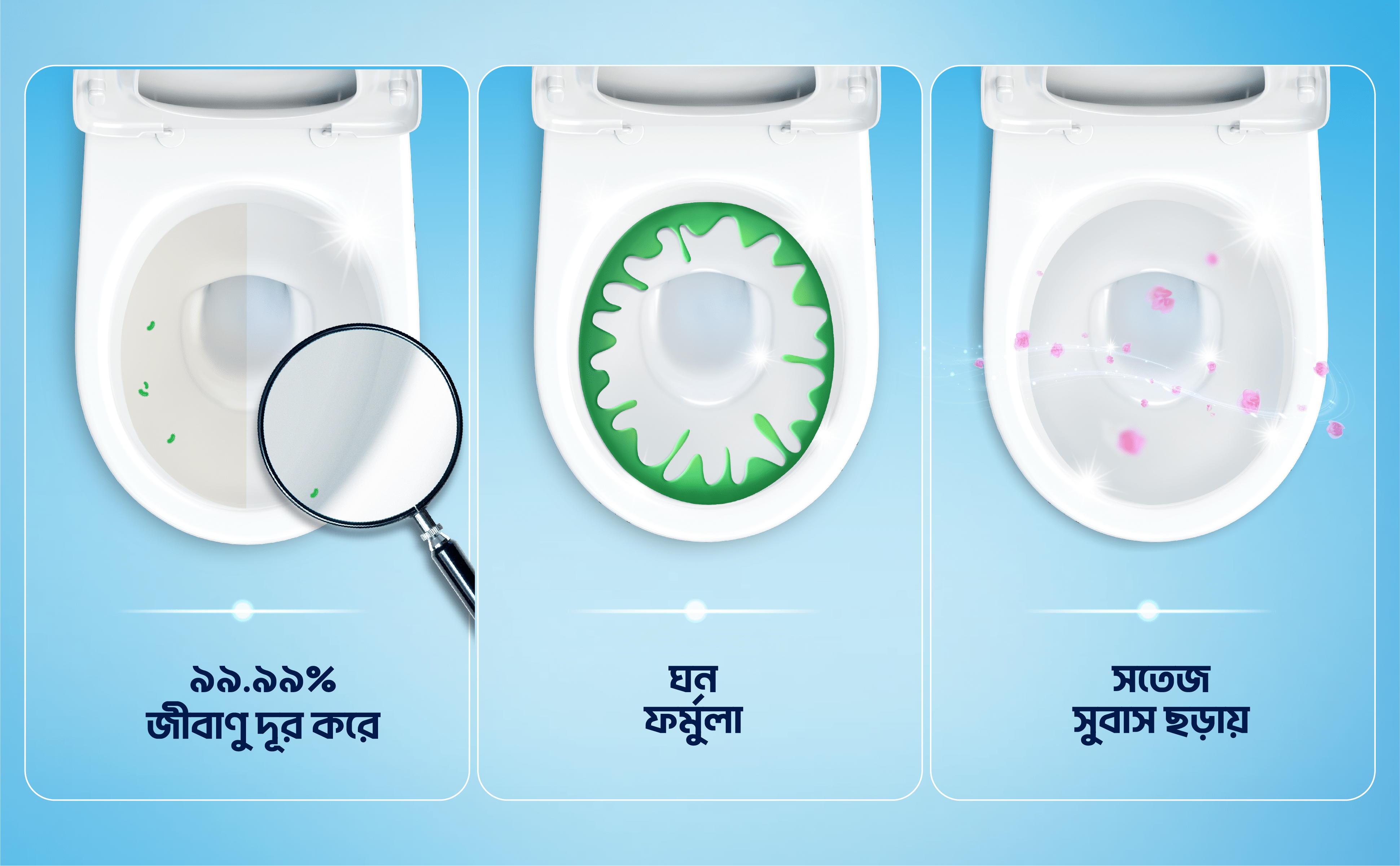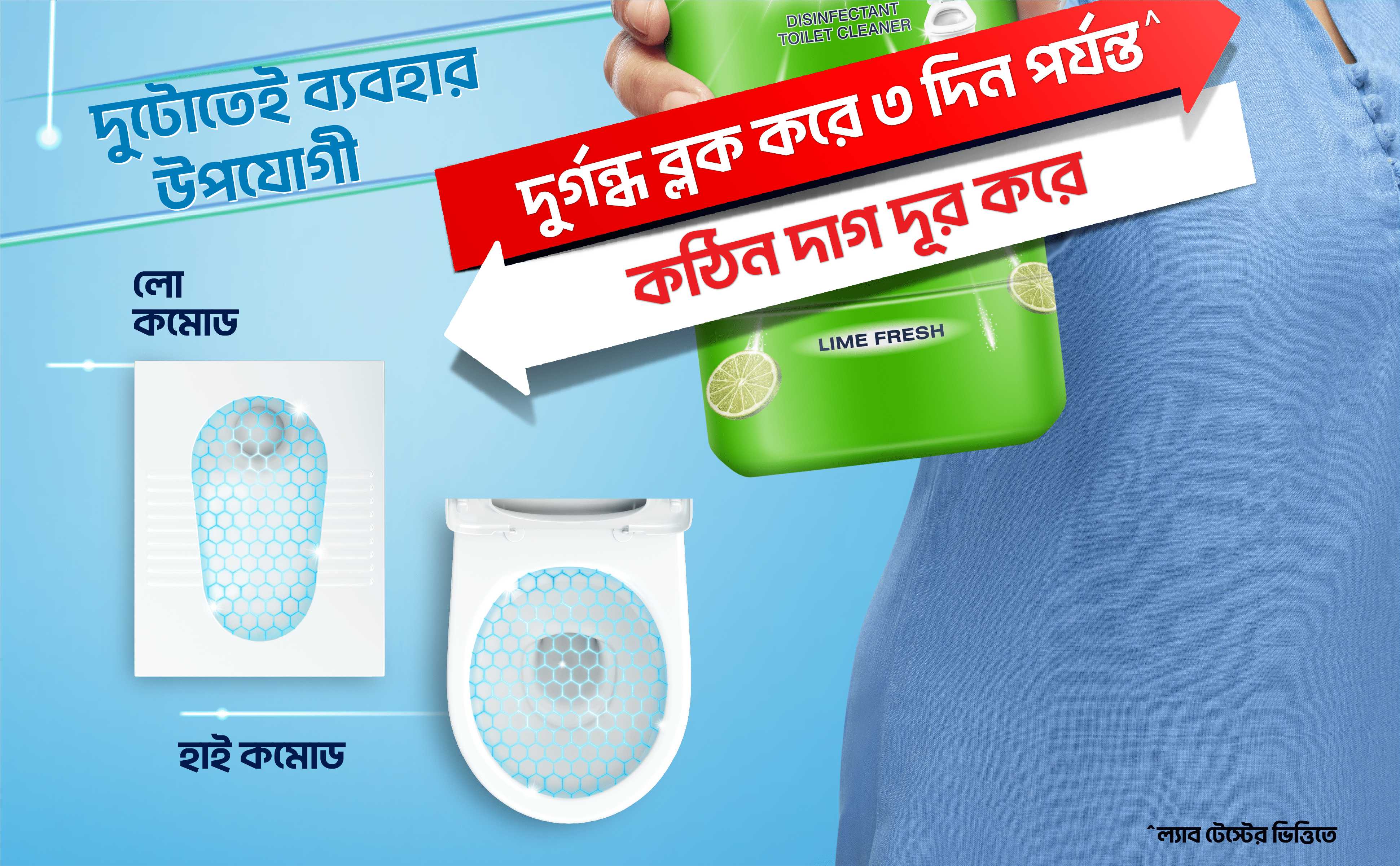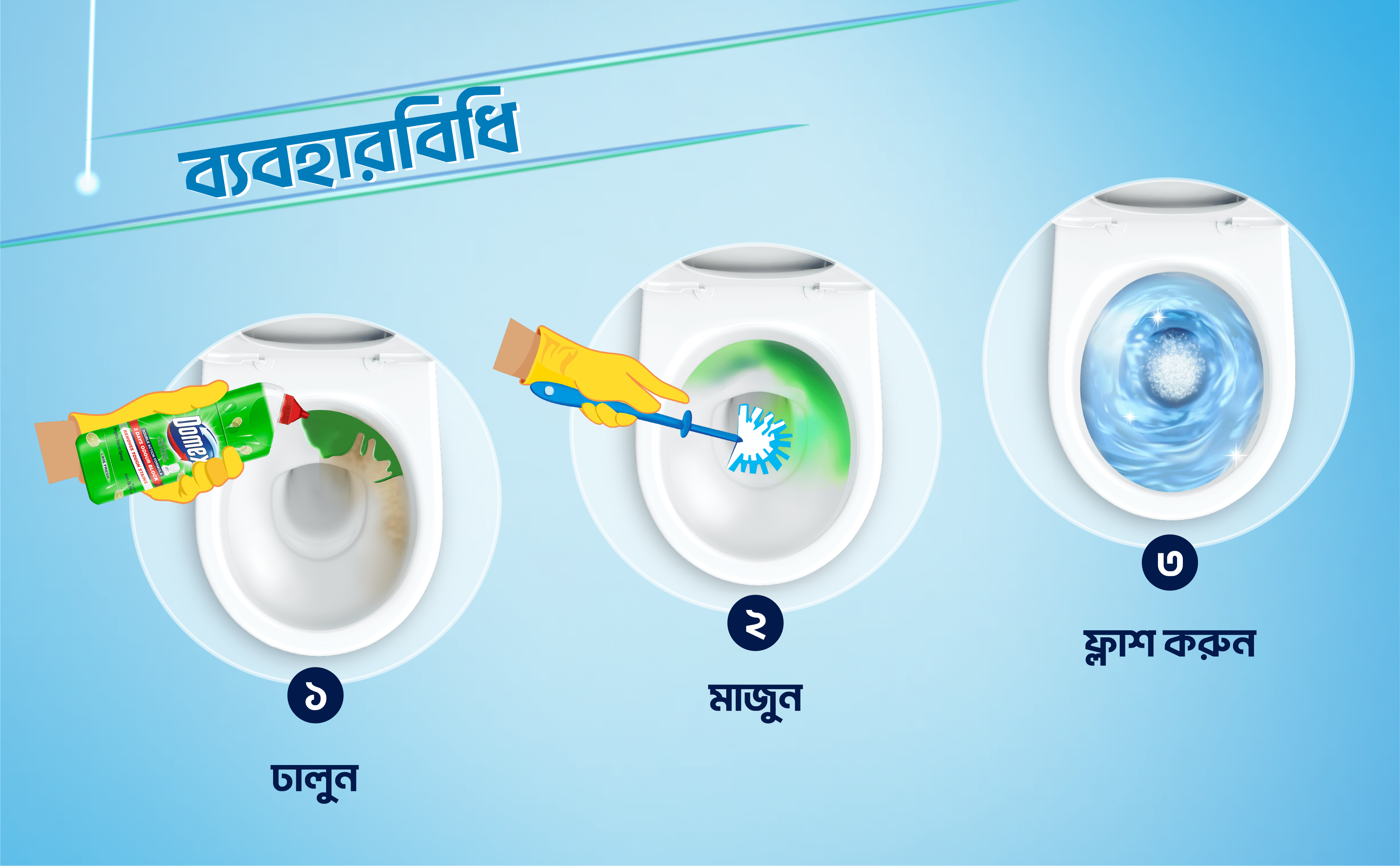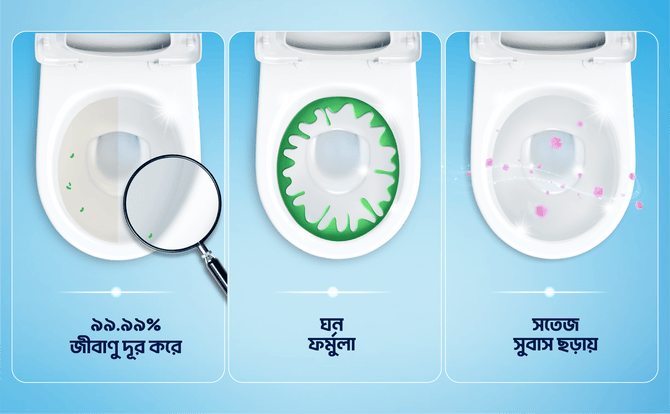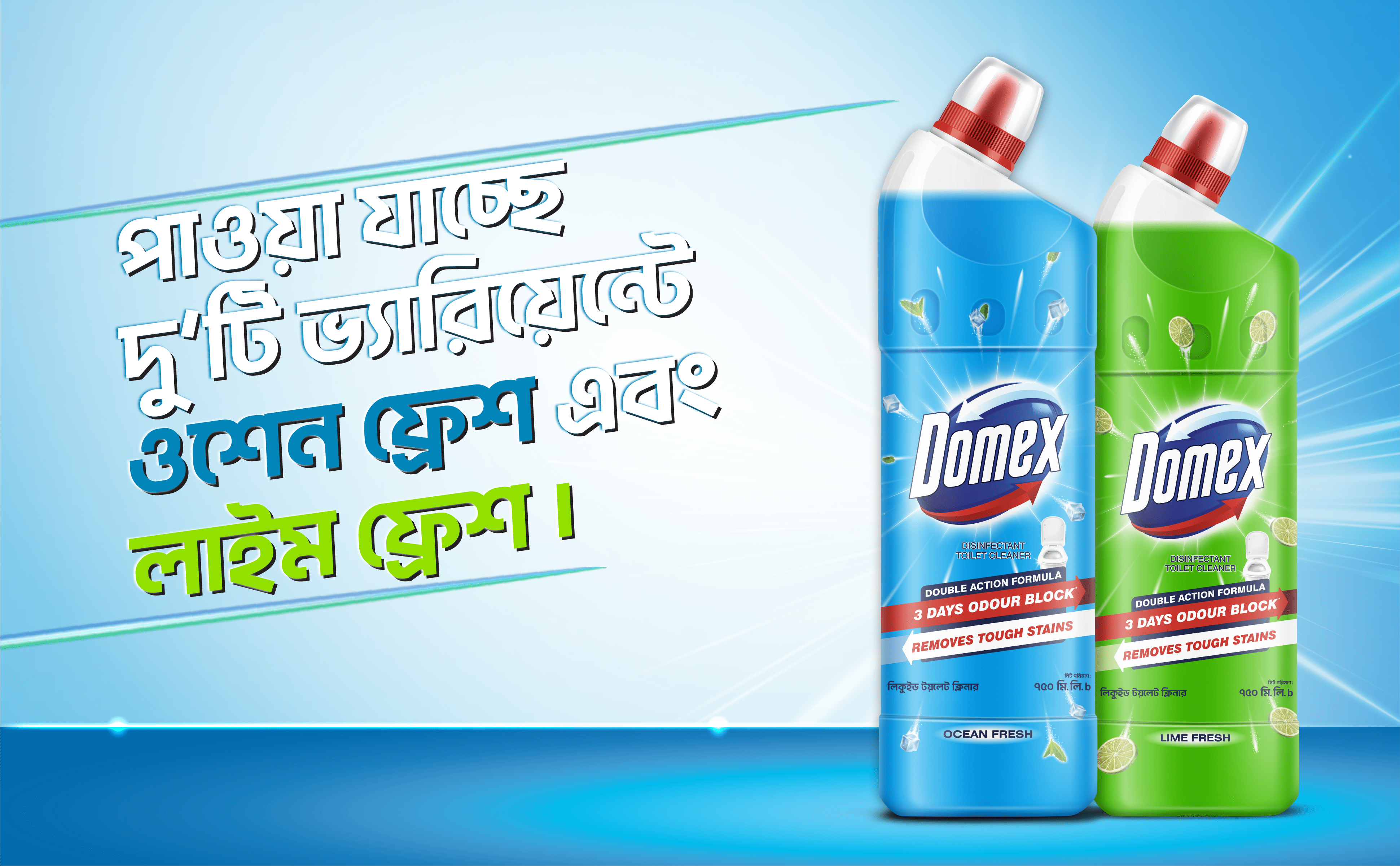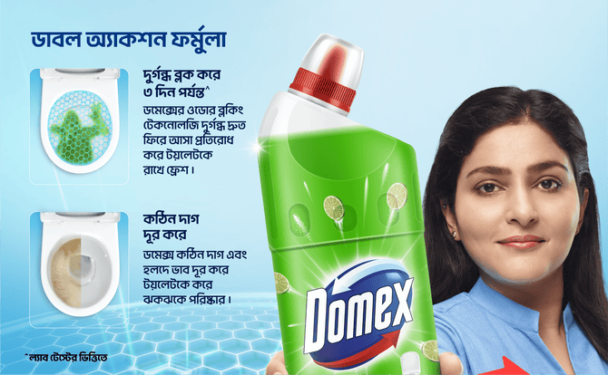 Domex Fresh and Clean is a powerful toilet cleaning liquid that gives you 2 times long lasting freshness*. Its thick formula helps it spread across the toilet bowl and helps in effortless cleaning. Its unique colour changing technology turns the product from green to blue when in contact with water. Its powerful cleaning agents remove the toughest stains and provide germ protection. It also gives your toilet a pleasant fresh fragrance and helps avoid odour for long. It’s 99.9% Germ-kill** formula makes it a quality disinfectant and its thick formula makes the fluid spread evenly, ensuring ease of use. Domex is a toilet cleaning expert. Domex Toilet Cleaner comes in 2 variants - Ocean Fresh and Lemon fresh with distinct fragrance.