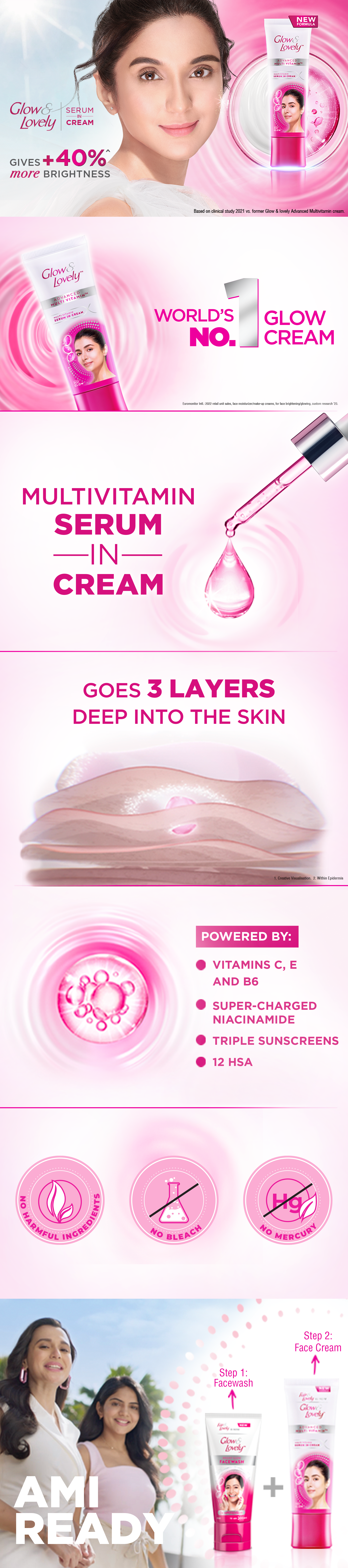 Glow & Lovely Advanced Multi Vitamin Cream (formerly known as Fair & Lovely) works like a skin expert to give you a radiant glow which is skin clarity, brightness, and Radiance. Enriched with Vitamin B3, C and E, this cream gets quickly absorbed and penetrates deep* into the skin, to brighten skin cells, reduce spots and illuminate skin from inside out. Vitamin B3 also known as Niacinamide is known to improve skin barrier, act as an anti-inflammatory, protecting the skin’s natural health and giving a glow. Vitamin C is known to protect the skin from external damage and is known to improve skin immunity and reduce spots. Vitamin E known to moisturize your skin from deep within keeping it hydrated. Allantoin helps remove dull skin cells from top layers of skin revealing soft smooth glowing skin. Also has antioxidants that helps reduce dark circles. This formulation is clinically proven to give an even-toned; glowing skin which is non oily. It has UVA & UVB sunscreens known to protect the skin by blocking UV rays. The product has no bleaching agents and is dermatologically tested and proven. Just dot over face and massage evenly over face and neck. Use twice daily for best results after cleansing skin. *Within Epidermis