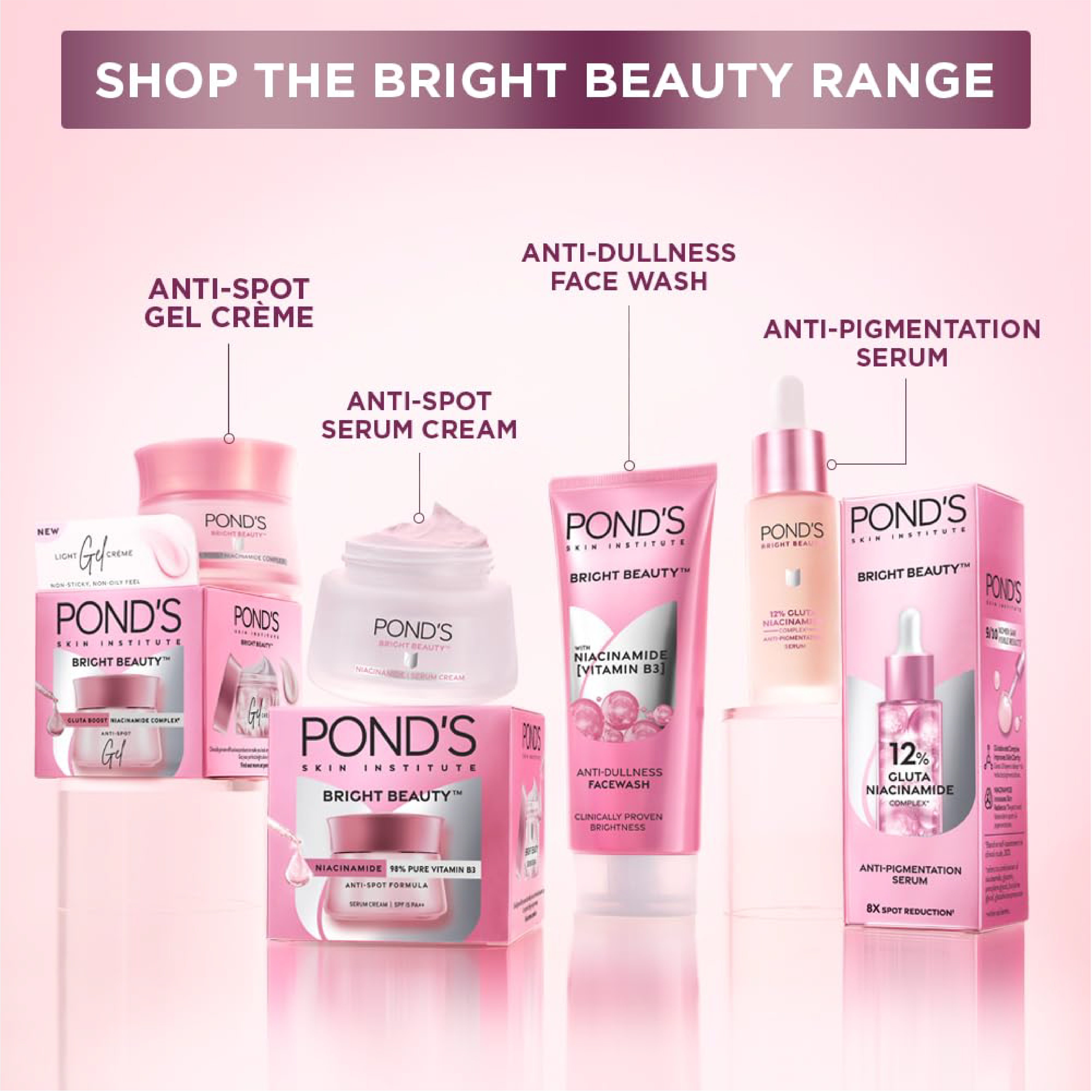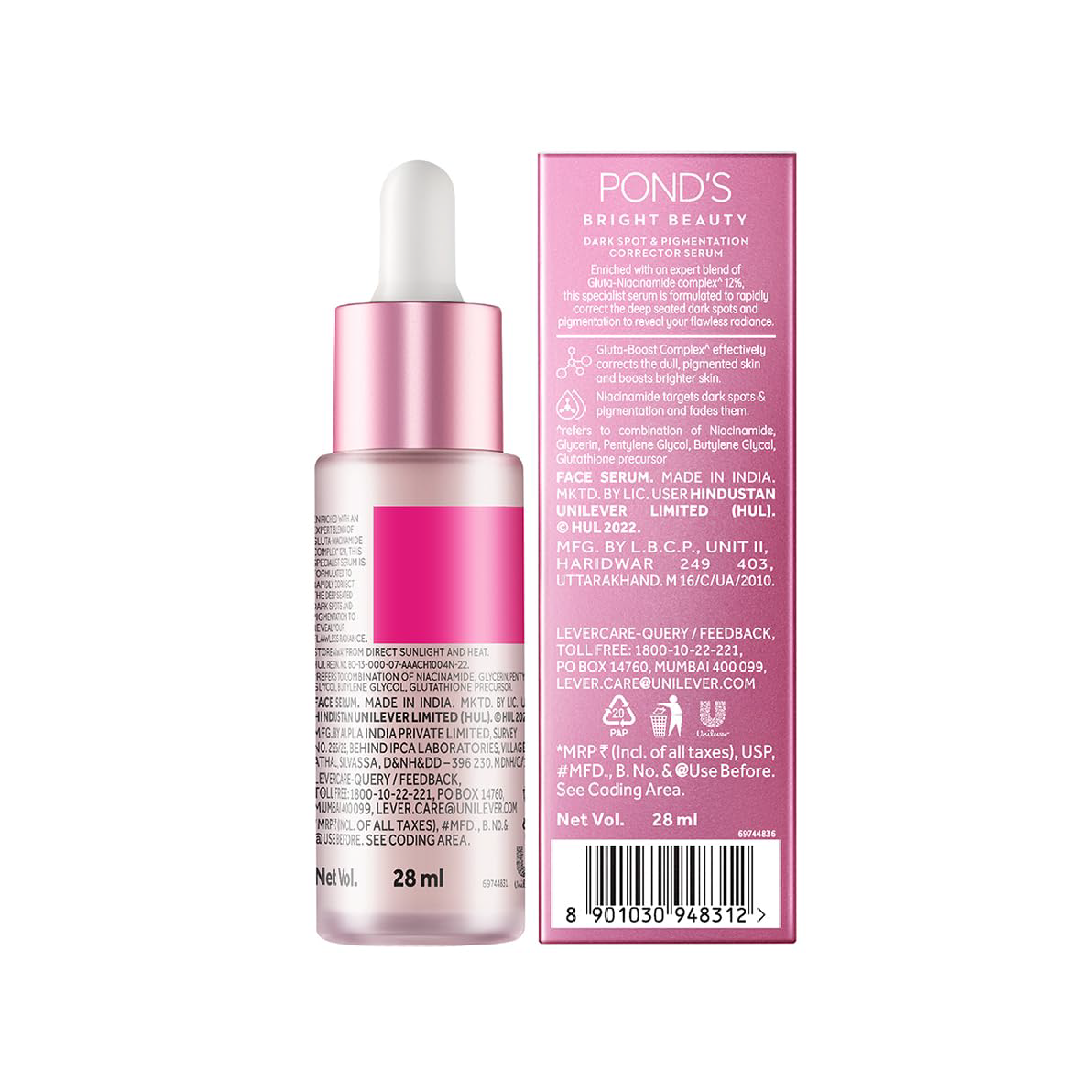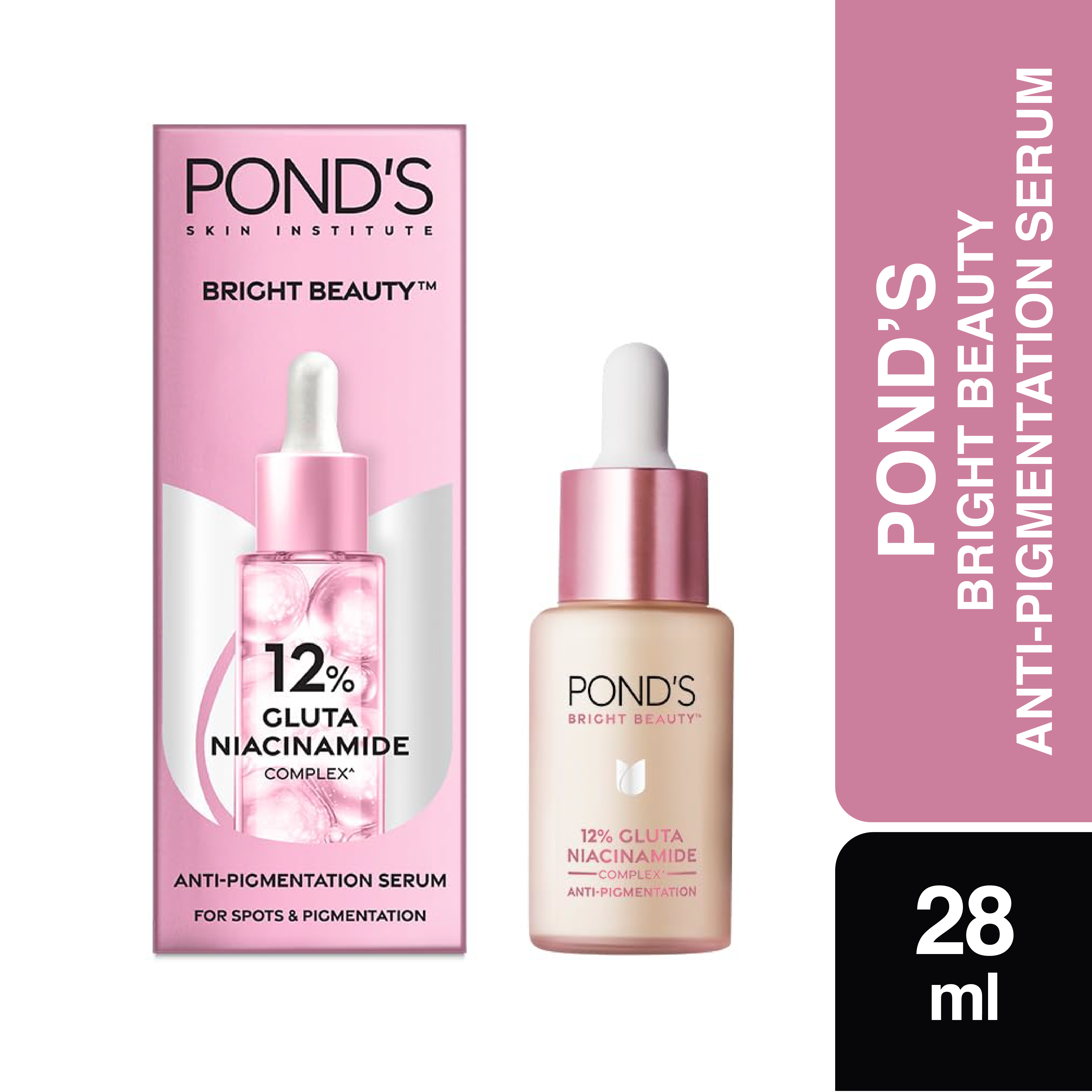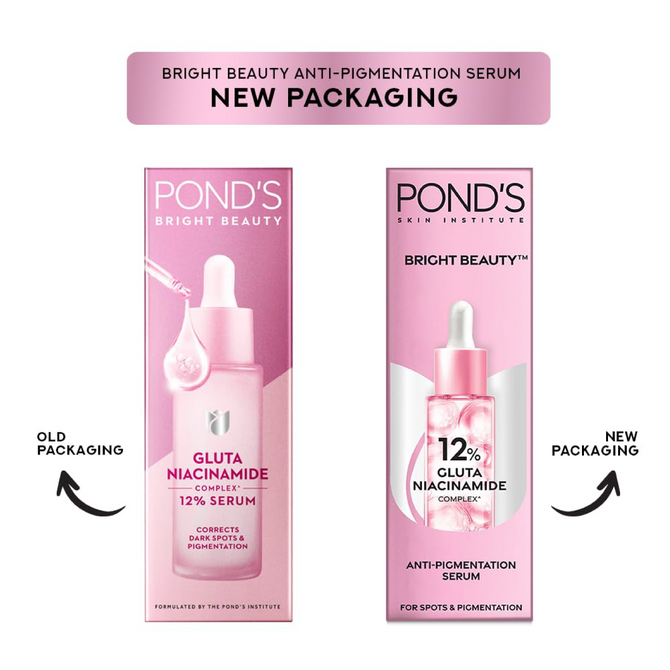 Induced with 12% Gluta Niacinamide Complex, Pond's Bright Beauty Anti-Pigmentation Serum penetrates 10 layers deep to repair and brighten your skin. This serum uses advanced technology that reduces pigmentation & dark spots in two weeks and its been clinically proven to do so. With the goodness of Niacinamide & Glutaboost, our Pond's Bright Beauty Anti-Pigmentation serum will help dissolve your deep-seated hyperpigmentation, repair any skin damage & boost the brightness of your skin from within. 3 out of 4 women saw visibly brighter and clearer skin after seven days of regular usage. This powerful duo gets absorbed 2X faster into your skin than any ordinary brightening cream. The active ingredients present in our new formula will keep your skin moisturized & plump without feeling greasy. Here are the 3 steps to get flawless skin- cleanse your face with our facewash, then treat it with our anti-pigmentation serum and then apply our bright beauty serum cream for a flawless radiance. With 2x more active ingredients, this serum has unbeatable brightening power. For best results: use twice daily, once during the day and once at night. 91% of users will start seeing visible improvements in pigmentation & dark patchesin just four days. Try it today and give your skincare regime a new direction.