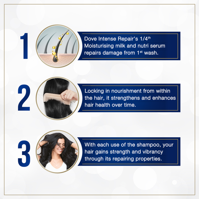 Dove Intense Repair Shampoo with Keratin Actives helps fortify protein at the cellular level, reduces breakage and gives you strong hair. Enjoy free-flowing lustrous locks with unbeatable damage repair.