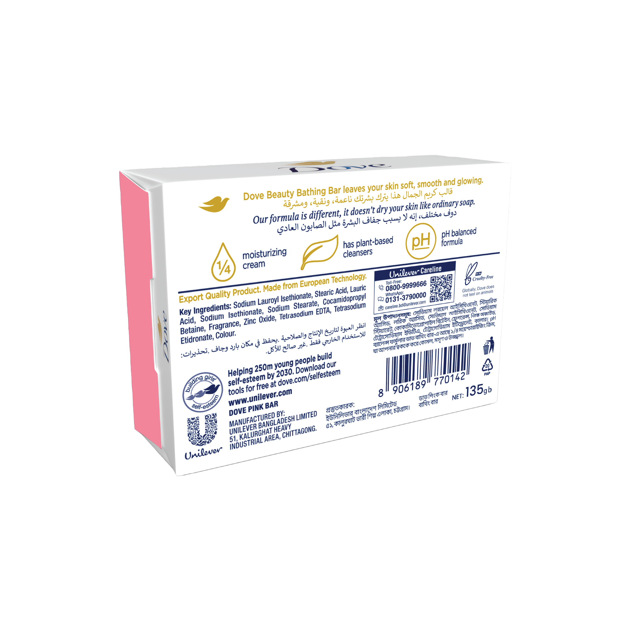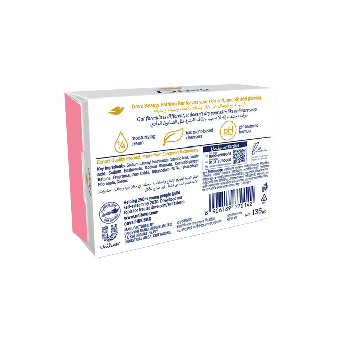 DOVE Pink Beauty Bar combines a gentle cleansing formula with DOVE’s signature ¼ moisturizing cream to give you softer, smoother and more glowing skin. The mild cleansers help your skin to retain its natural moisture rather than stripping it away. This DOVE bar even helps to replenish nutrients that are lost during the cleansing process – where a regular soap bar might leave your skin feeling dry and tight, a DOVE Pink Bar leaves it feeling soft and smooth. It’s not a soap – it’s a beauty bar Washing with regular soap can cause skin to feel dry, tight and irritated as some cleansing ingredients strip skin of essential nutrients. What makes DOVE different? Its gentle cleansers help your skin retain its natural moisture and its mild formula is kind to your skin. DOVE is the No.1 Brand recommended by dermatologists in India. For best results, lather up your DOVE Beauty Bar and massage the smooth, creamy lather over your face and body before rinsing thoroughly. For soft, smooth hands, you can also enjoy regular hand-washing throughout the day with your DOVE bar. Soap may dry out your hands, but the classic moisturizing formula of DOVE bars will leave skin softer, smoother and more glowing.