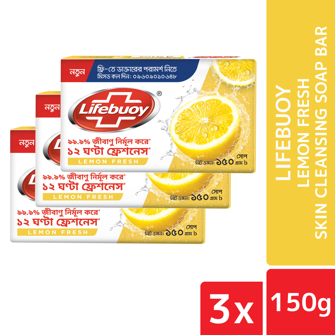 Experience a refreshing shower every day with LIFEBUOY Lemon Fresh Soap Bar. It rejuvenates your senses keeping you fresh throughout the day. Formulated with an efficient cleansing property of lemons, this soap bar is packed with natural antibacterial properties. This disinfectant soap protects your skin from disease-causing bacteria and ensures 100% better germ protection for you and your family. The citrusy fragrance will leave you thoroughly fresh. Shop now!